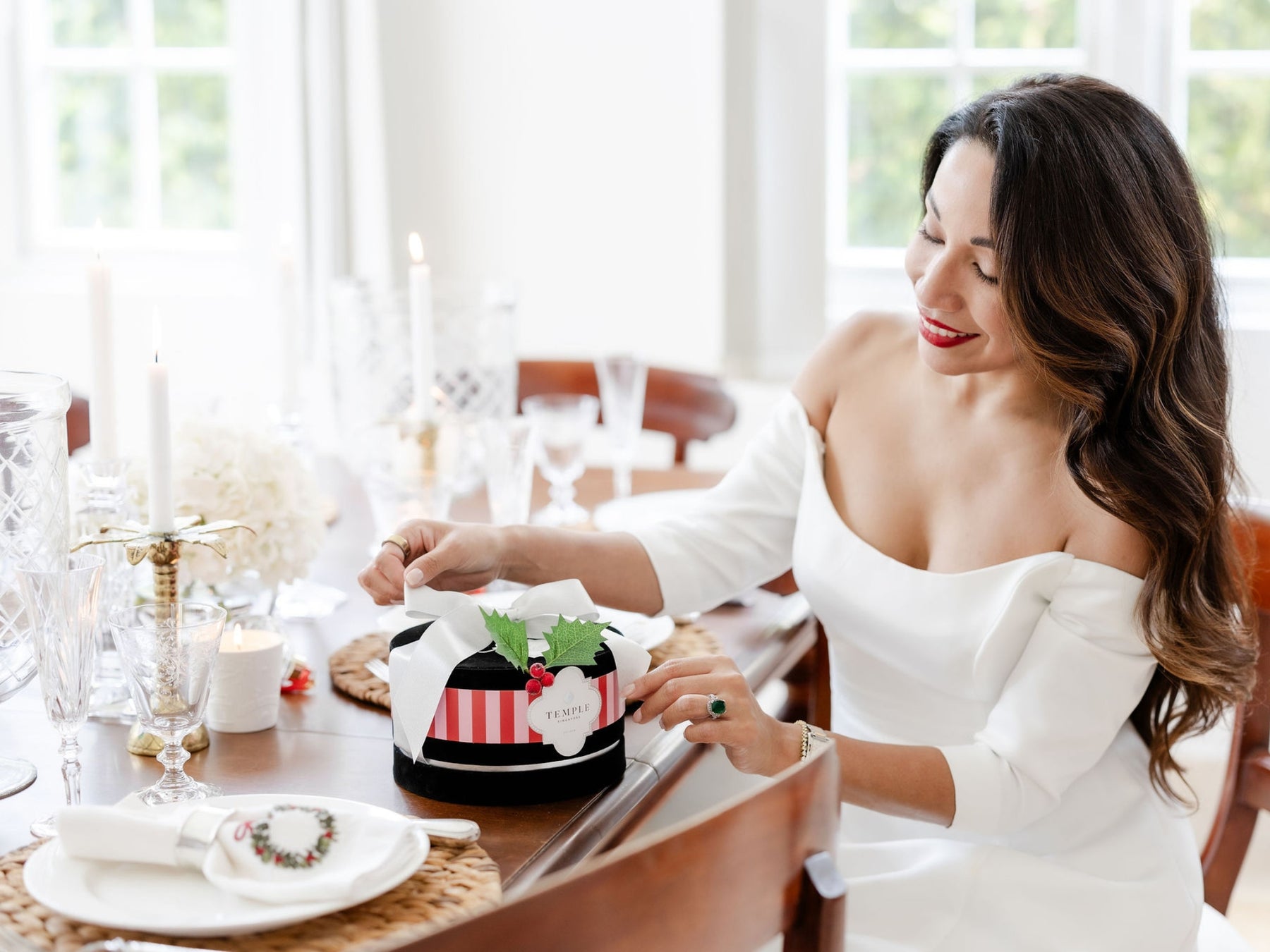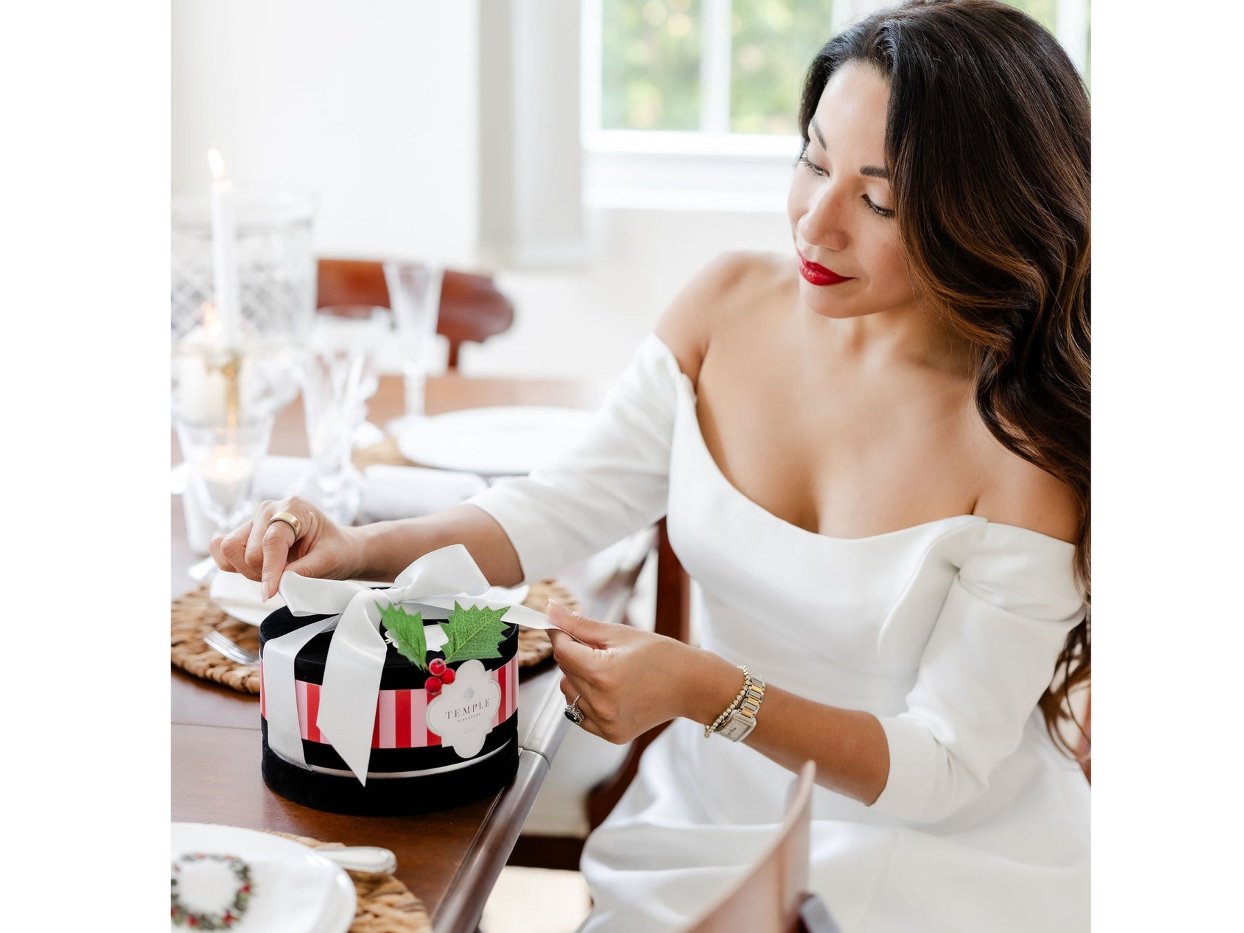 Every candle is hand-poured, hand-polished, and hand-packed into our signature black velvet hat box, perfectly finished with a silver ribbon, holly berry trim, and a merry striped festive sleeve. Softly scented and beautifully radiant, these glamorous little darlings add a sophisticated layered effect when styled with our larger candles.